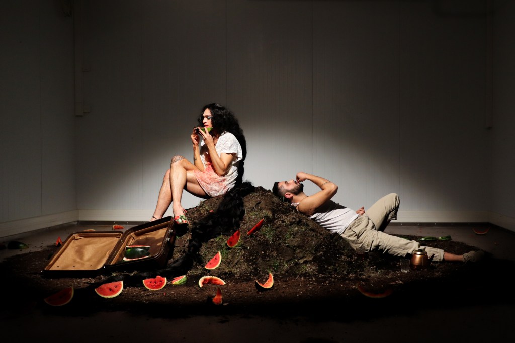 The work tries to be a live testimony on the current situation of besieged Palestinians inside the occupied territories as well as drawing on the generational displacement the stateless Palestinians of the diaspora suffer from. The performance aspires to use the simple indication of the watermelon as a powerful symbolic intro and a tool to spark curiosity and awareness around not only the Palestinian cause but about many other besieged and marginalised communities sweltering under patriarchal cis-tems apartheid and dictatorships. It is a modern adaptation on the silencing of freedoms of speech, it’s an artistic protest, a sit-in against the power structures and the current international political atmosphere, reflecting on inner queer identities living under apartheid and outer struggles of the displaced individuals living in exile.